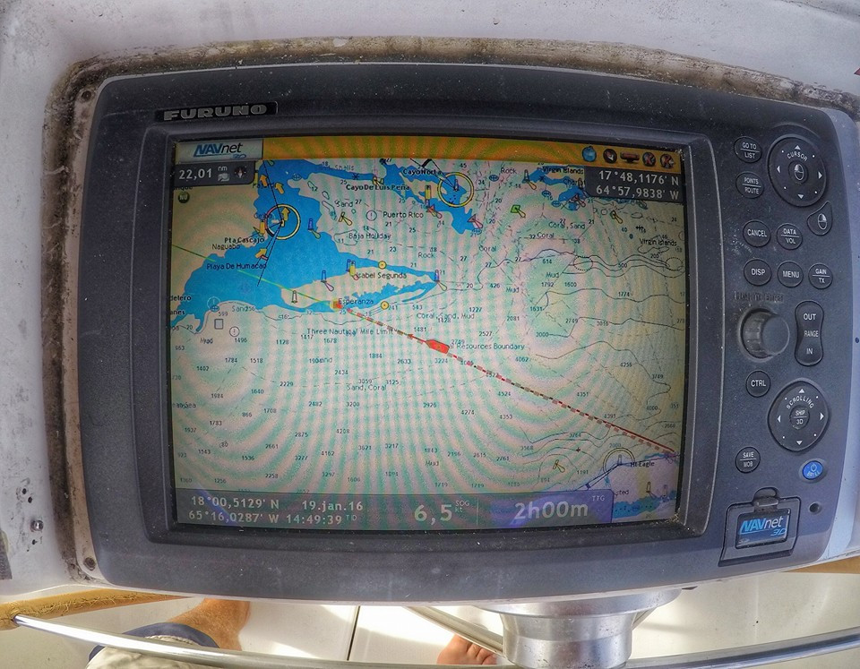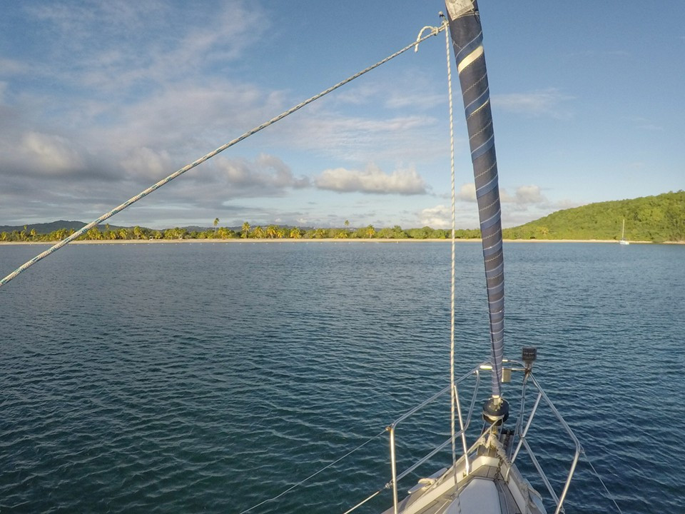 Anchored in Ensenafa Sun Bay, Puerto Rico after eight and a half hour from Christiansted, St. Croix. Very nice crossing. Anchored in 12 feet of water in a big bay with a looong beach, and only four other boats. Truly one of Caribbean's hidden gems. Dead calm, and the sun is setting behind us.