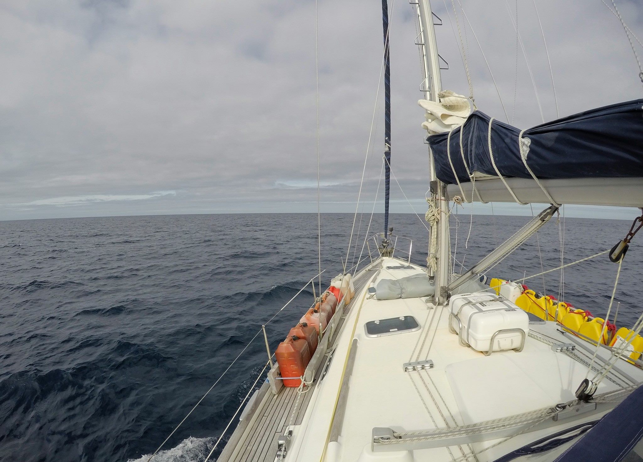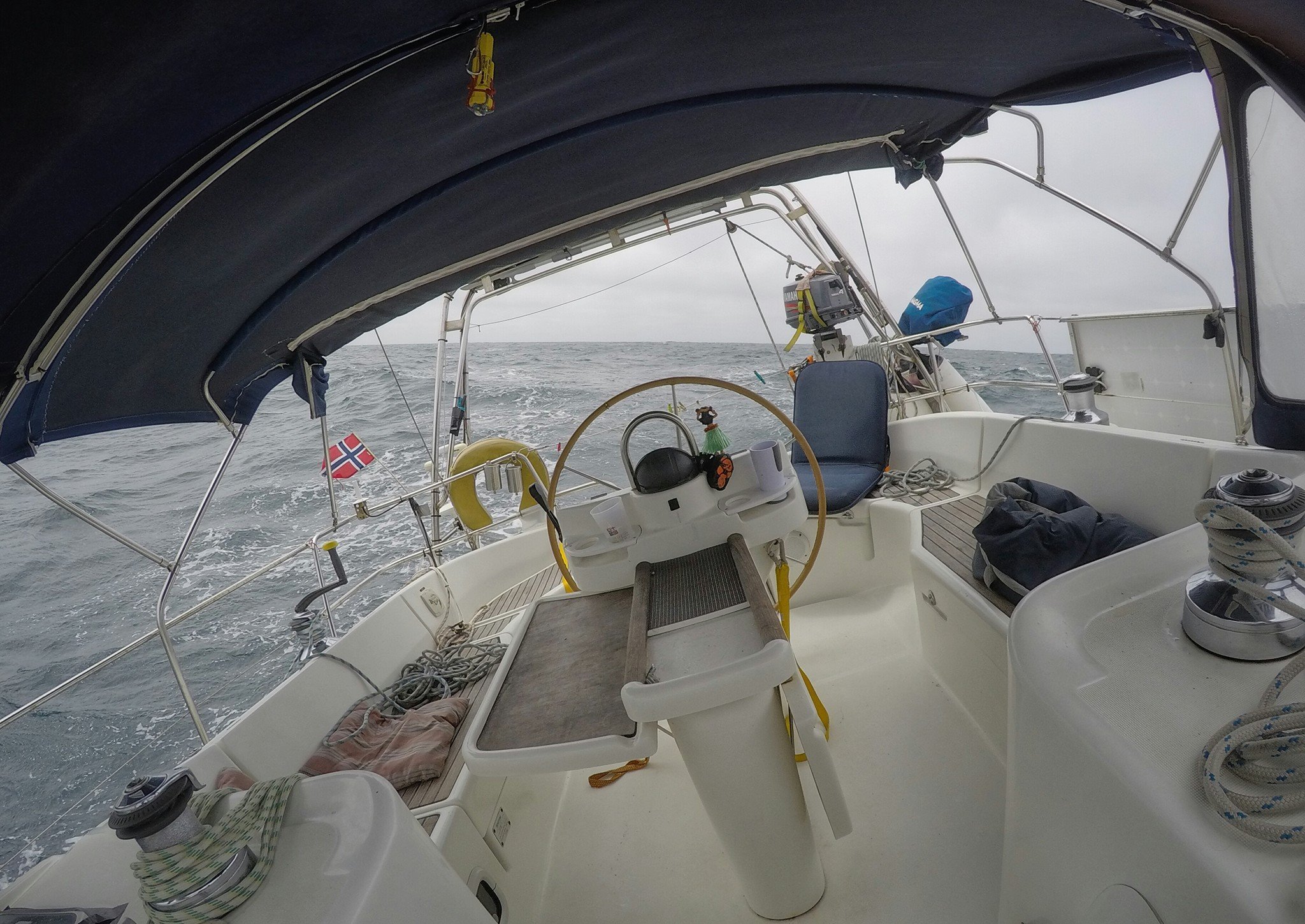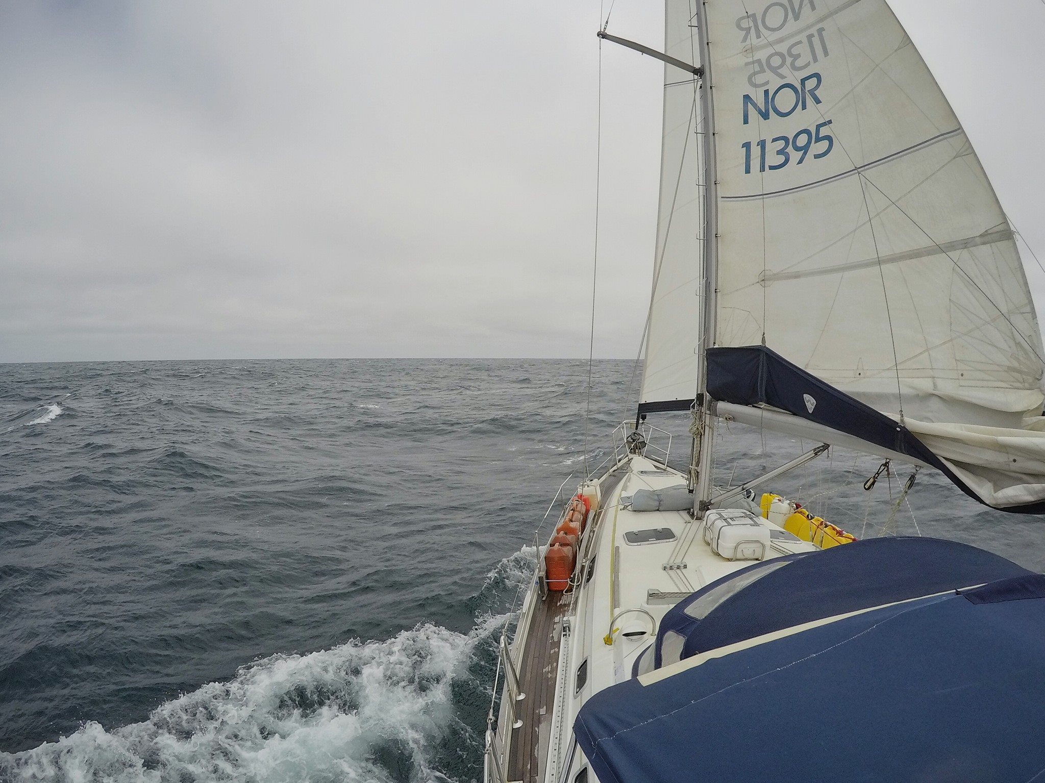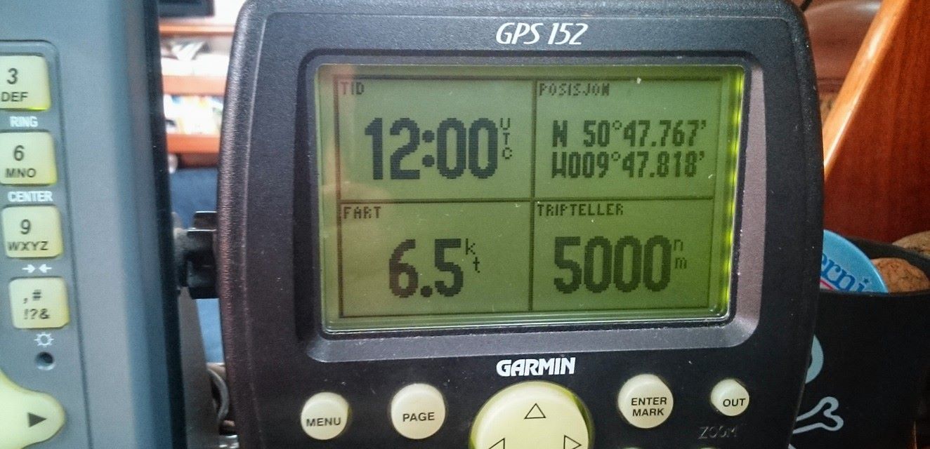We departed Horta on the isle of Faial in a nice breeze from NE. Since that also was the direction we were headed, we were blown a bit off course in the beginning. As we entered a high pressure system north of Azores, we had to motor for two days to get through it. When we came out on the other side, the wind was NW. For about a week, we had the wind directly in on our port side. Combined with 2-3 meters waves, the boat heeled over and was rocking constantly. Doing anything constructive on board was impossible. We mostly slept, read books and played games on the tablet. Just doing simple tasks like going to the toilet or making dinner was a challenge. Fortunately, we had vacuum-packed a lot of pre-cooked meals before we left Horta.