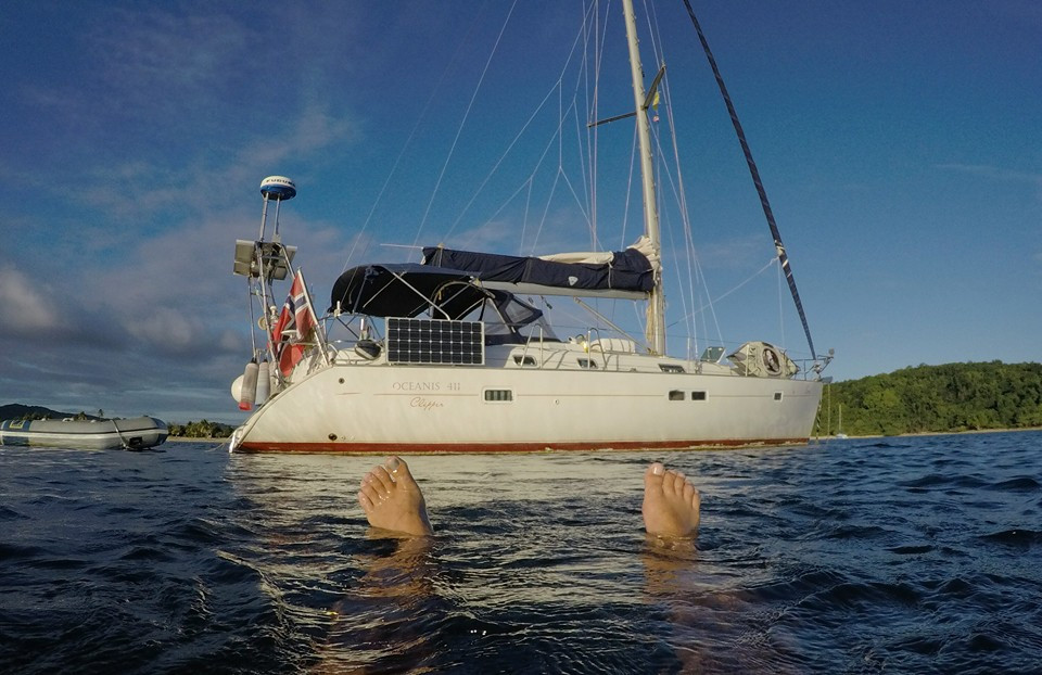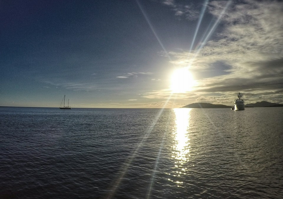 Anchored in Ensenafa Sun Bay, Puerto Rico after eight and a half hour from Christiansted, St. Croix. Very nice crossing. Anchored in 12 feet of water in a big bay with a looong beach, and only four other boats. Truly one of Caribbean's hidden gems. Dead calm, and the sun is setting behind us.