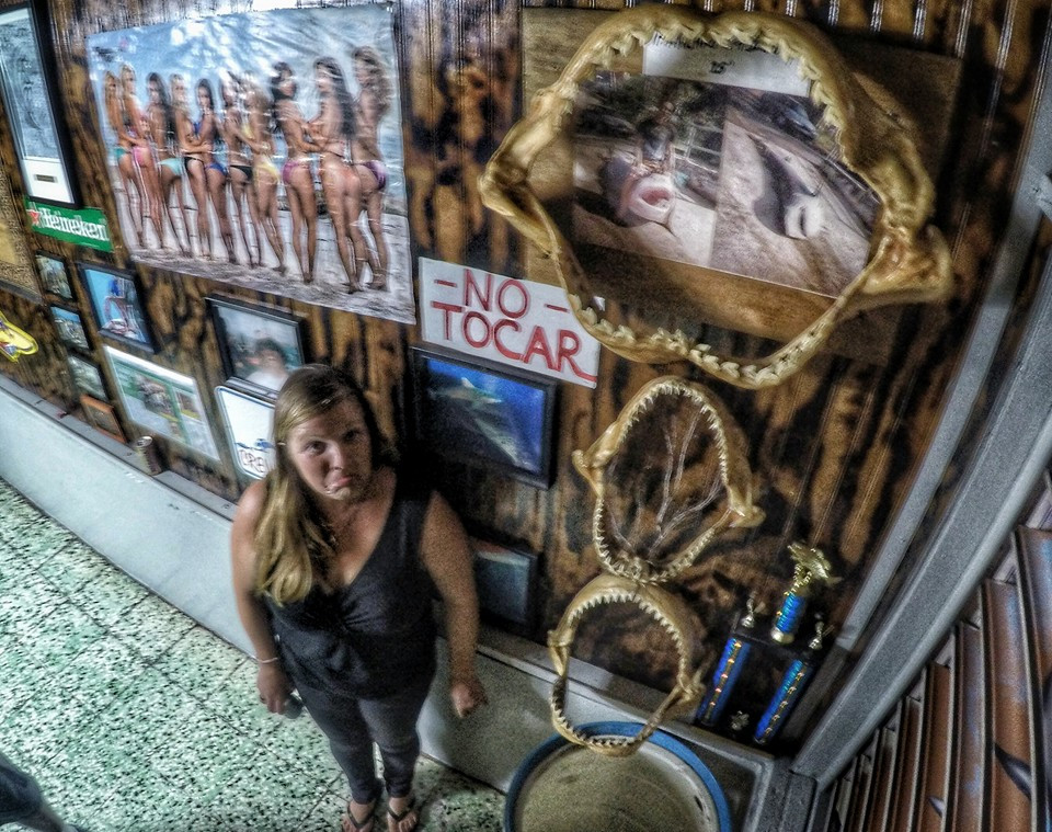Anyways, the bartender turned out to be a SHARK HUNTER! He had a box full of shark teeth, and he had lots of pictures and shark jaws hanging around in his bar. He told Kristine that some times the tiger sharks comes into into the bay at low tide. So now Kristine will never more swim in this harbour.