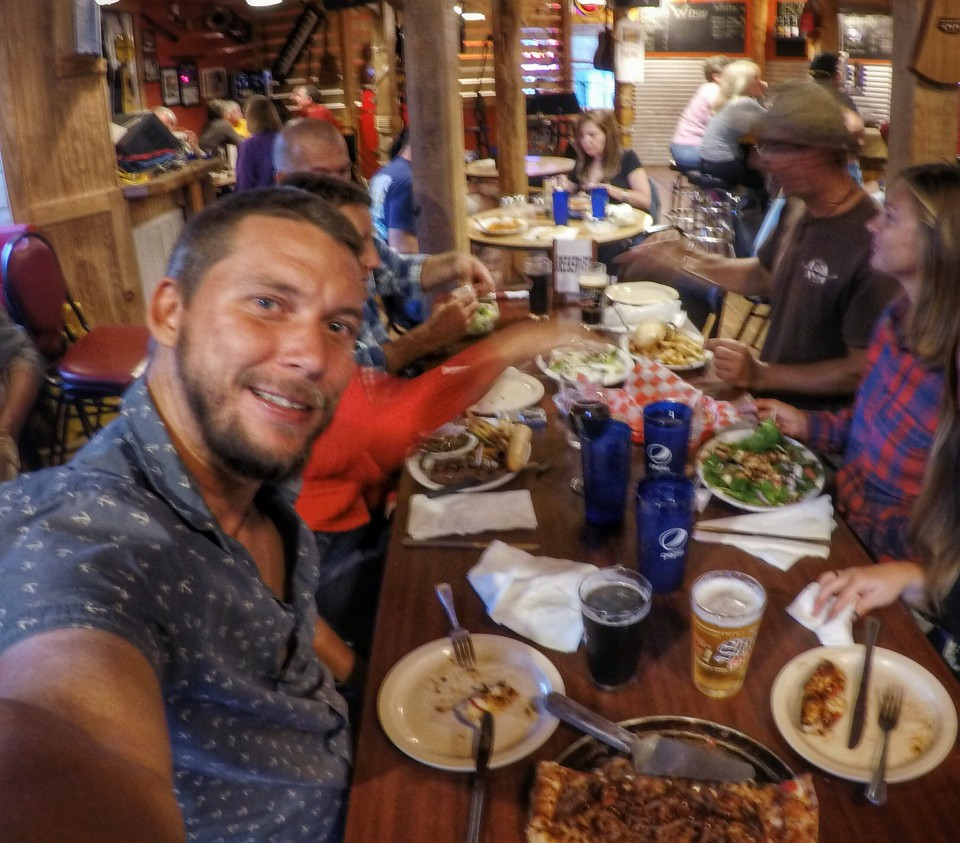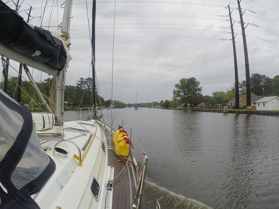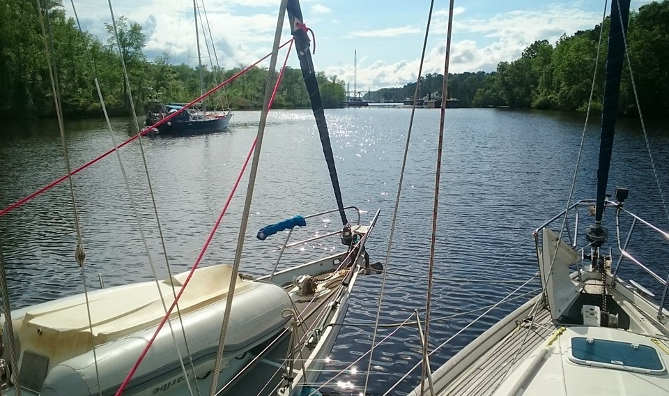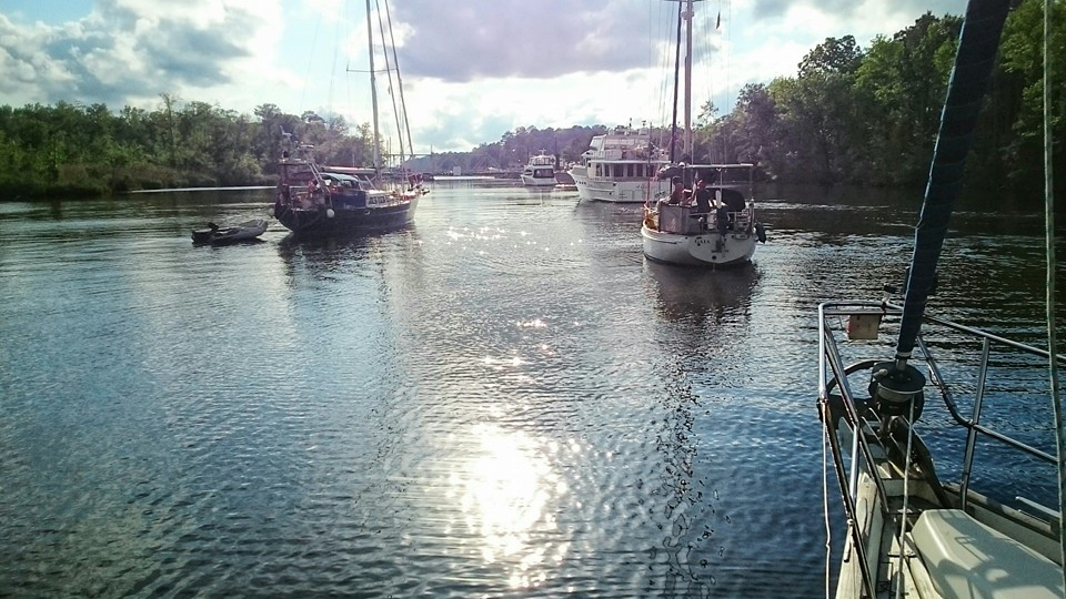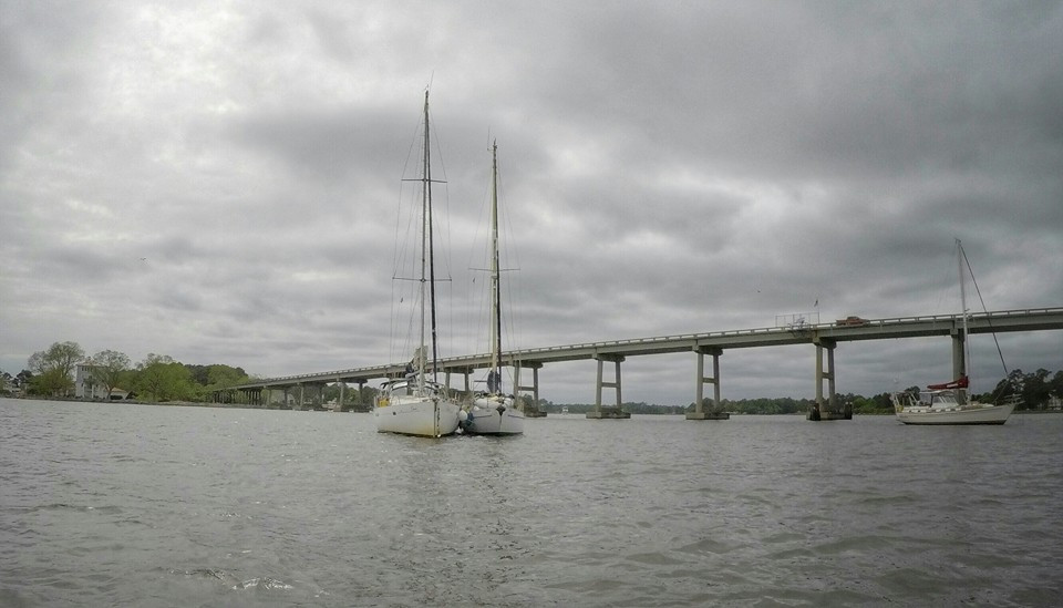 Rafting up while waiting for a bridge opening.