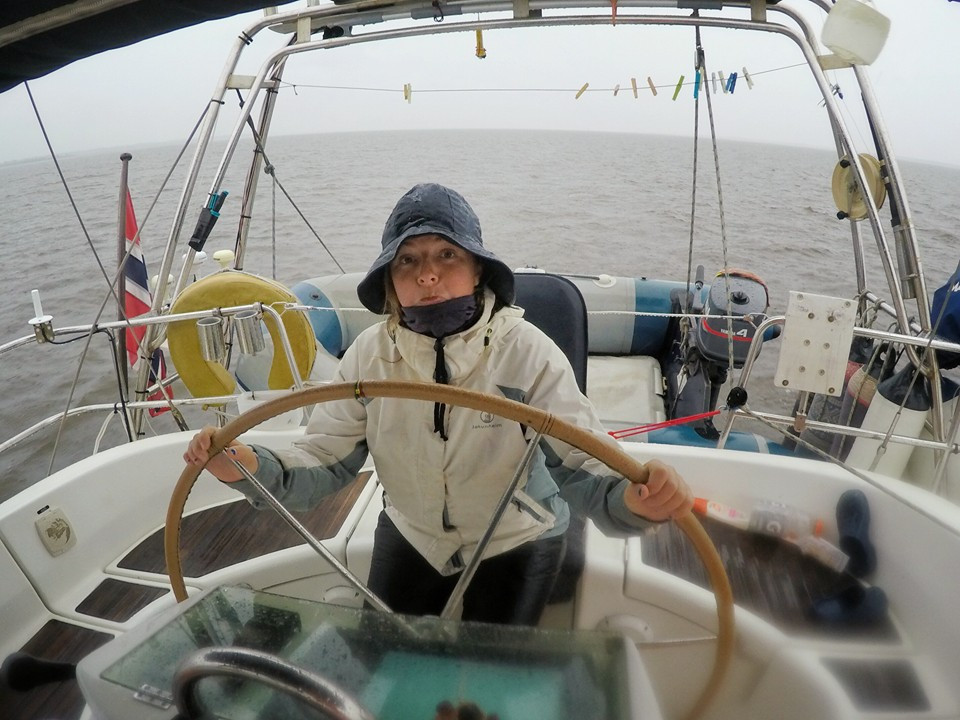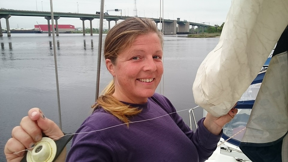Kristine sewing the mainsail.