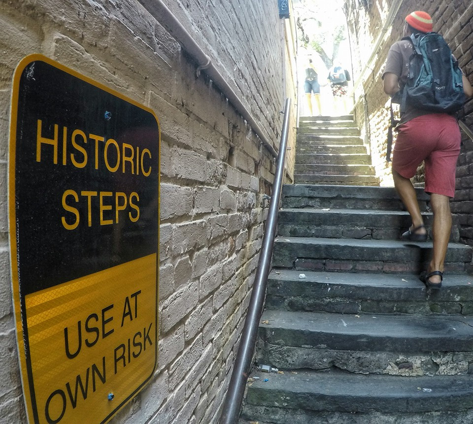 Warning: old steps. It was amazing watching Americans descend these deadly stairs, slowly, one step at the time, holding on to the rails with both hands!
