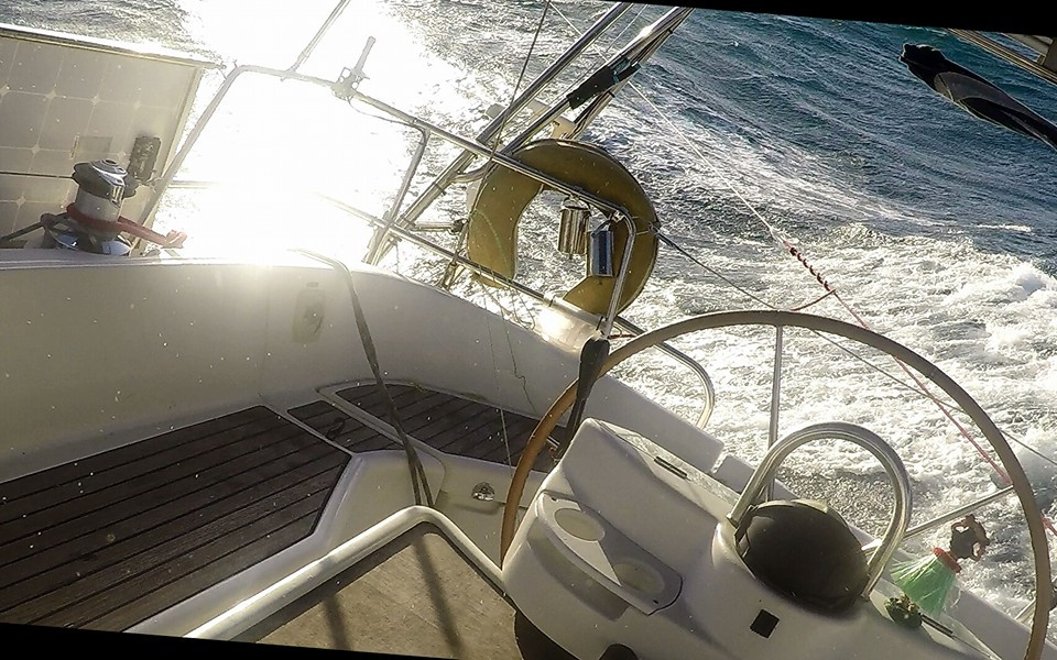 For berre reva storsegl vart vi løfta høgt opp på bølgjetoppane, og surfa ned att i full fart på andre sida. Vinden auka stadig, og bølgjehøgda likeeins. Som om det ikkje var nok, kom bølgjene inn frå to ulike retningar. Vi følte etter kvart at vi mista kontrollen over båten. Emma vart lita mellom dei store bølgjene, og styringa vart stadig meir krevjande. Då ein brottsjø slo over båten, var det nok. Bølgja slo laust eit solcellepanel, flaggstonga med flagg knakk og reiste over bord, eit vindauge i sprayhooden vart slått inn, og diverse lausøyre i cockpit for over bord. Vi fann det best å slengje ut eit drivanker i hekken, skalke lukene og vente under dekk til vêret roa seg.