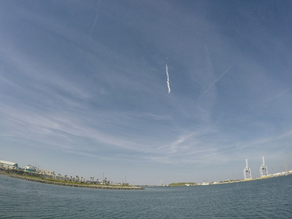 We were pretty far from the launch site, so the rocket appeared tiny in the distance. We first saw it's bright flame pushing it straight up, and after 15 seconds or so, the thunderous sound finally caught up to our viewing location In Cape Marina.