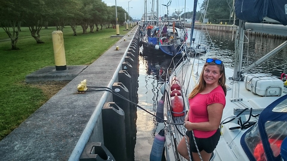 Kristine handling the ropes in a lock.